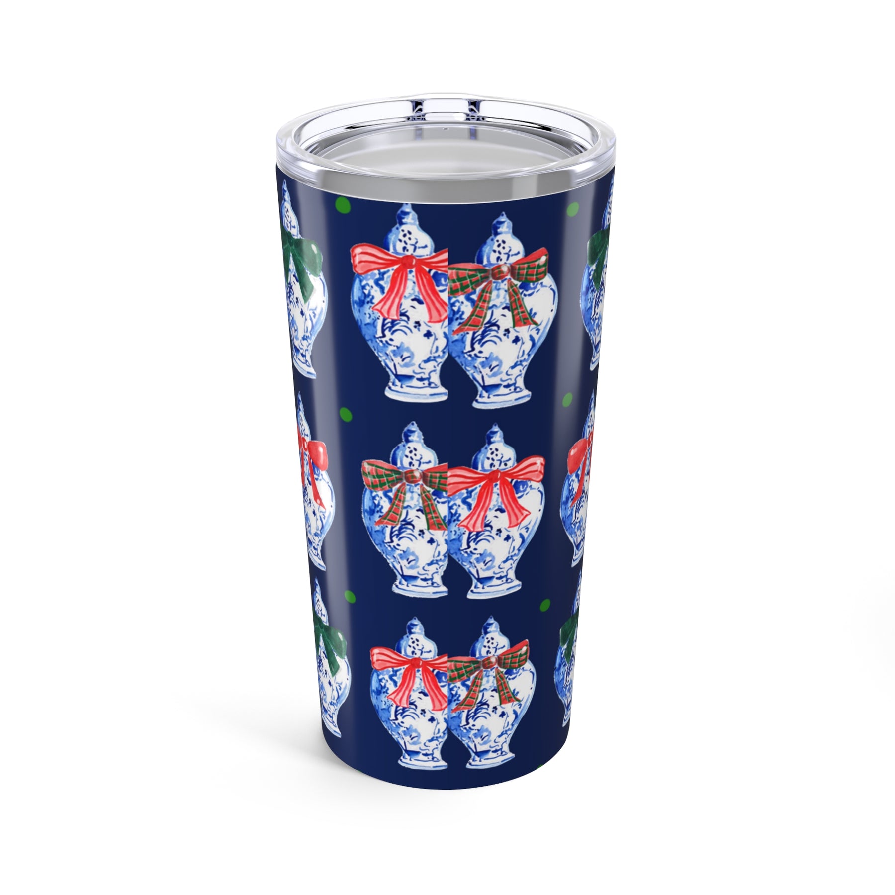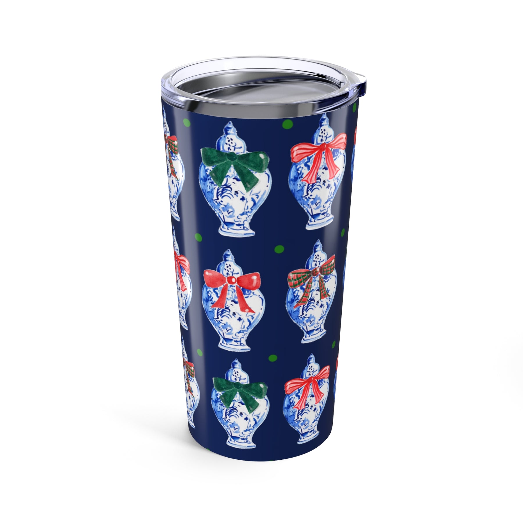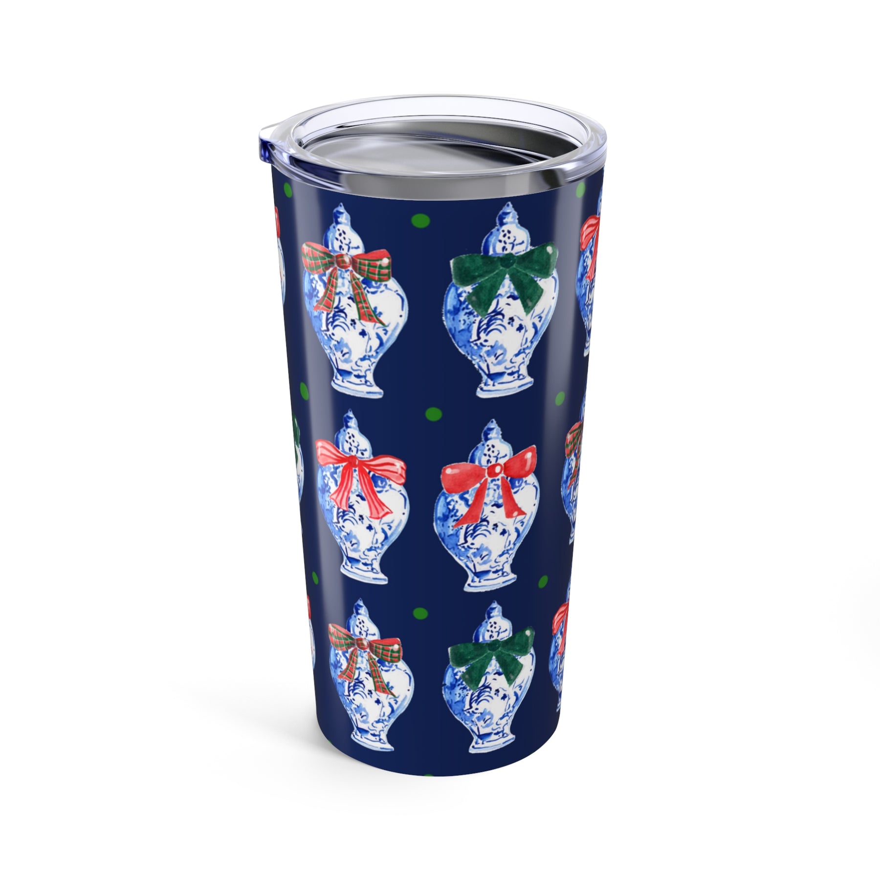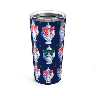20oz Holiday Ginger Jar Tumbler — Blue Porcelain Vase Pattern with Festive Bows