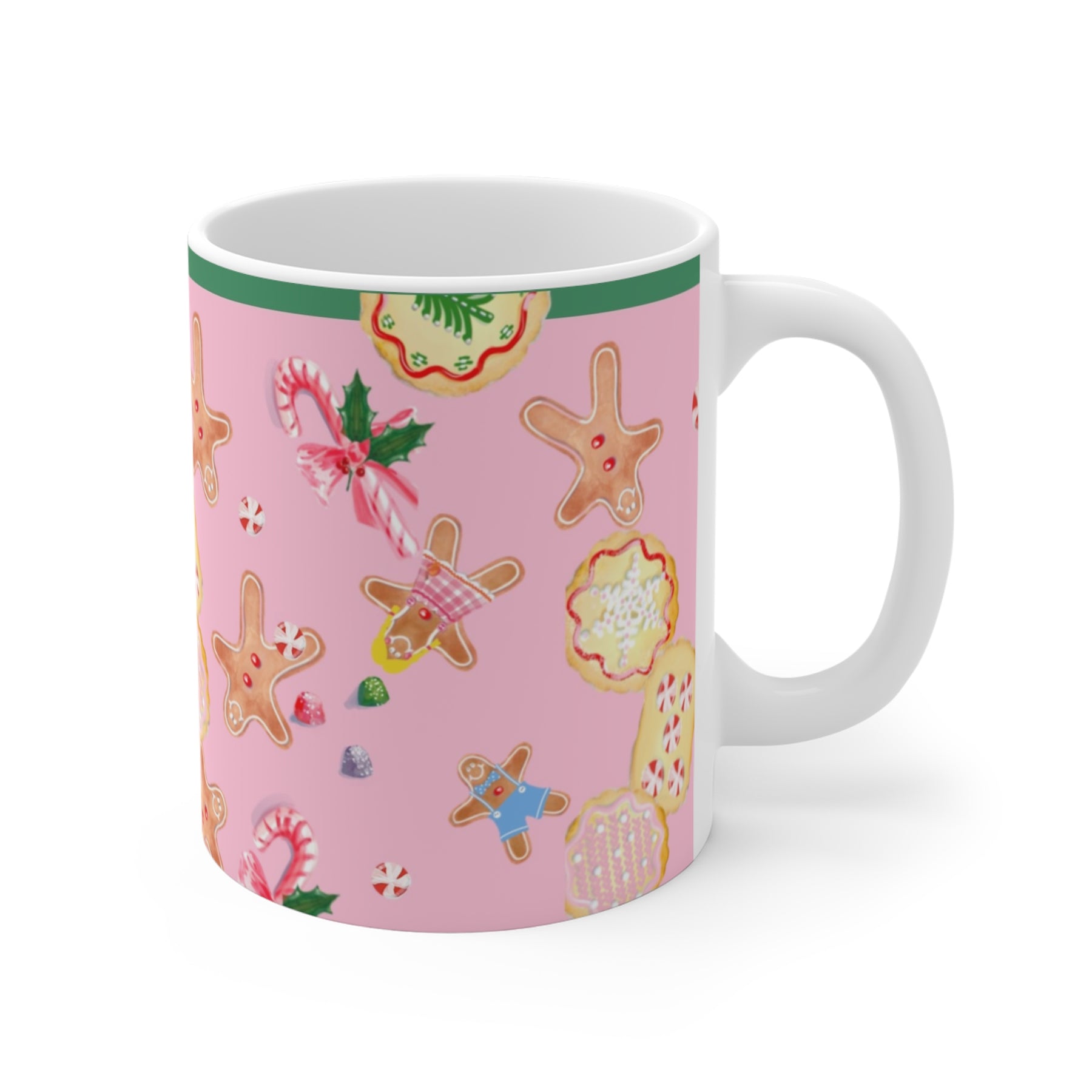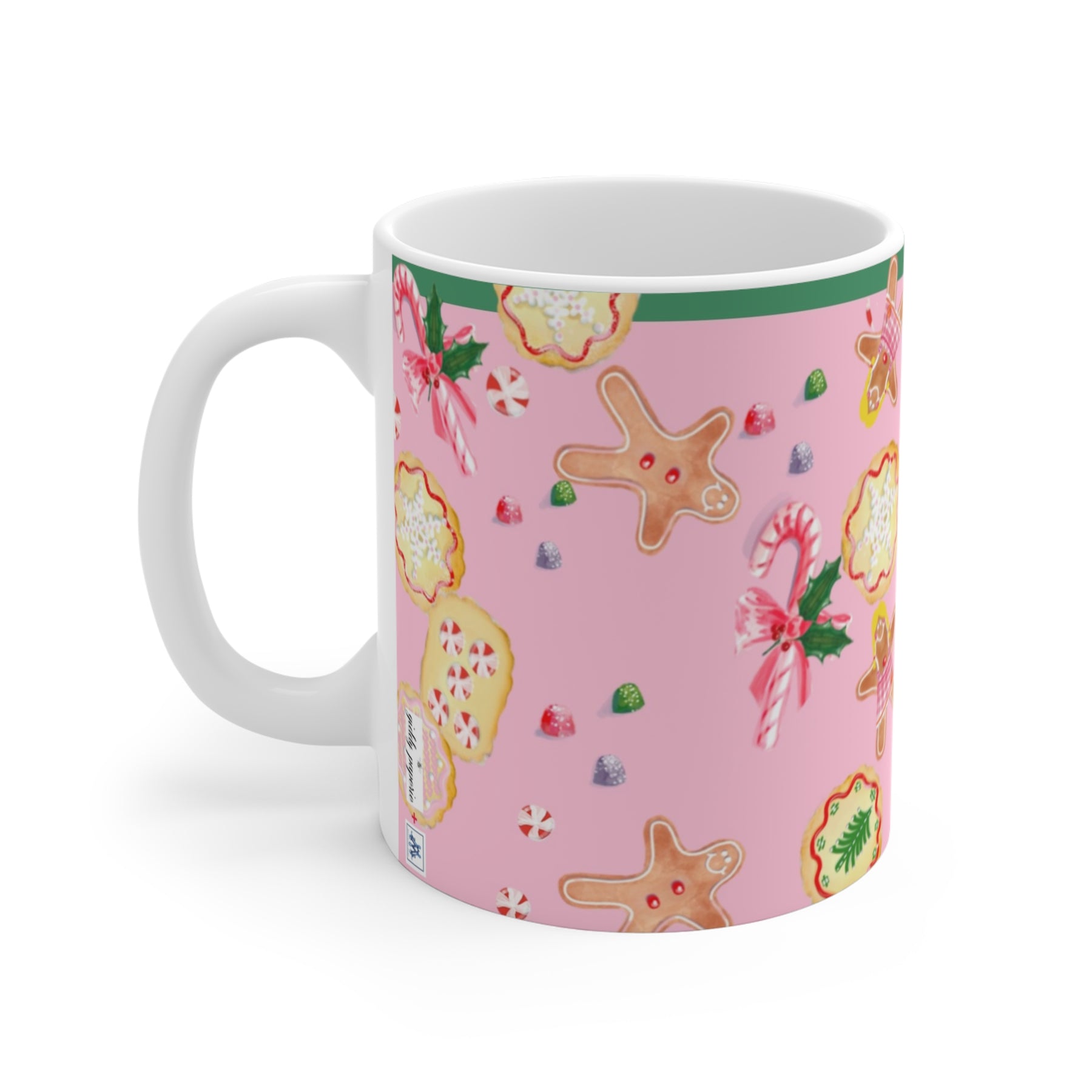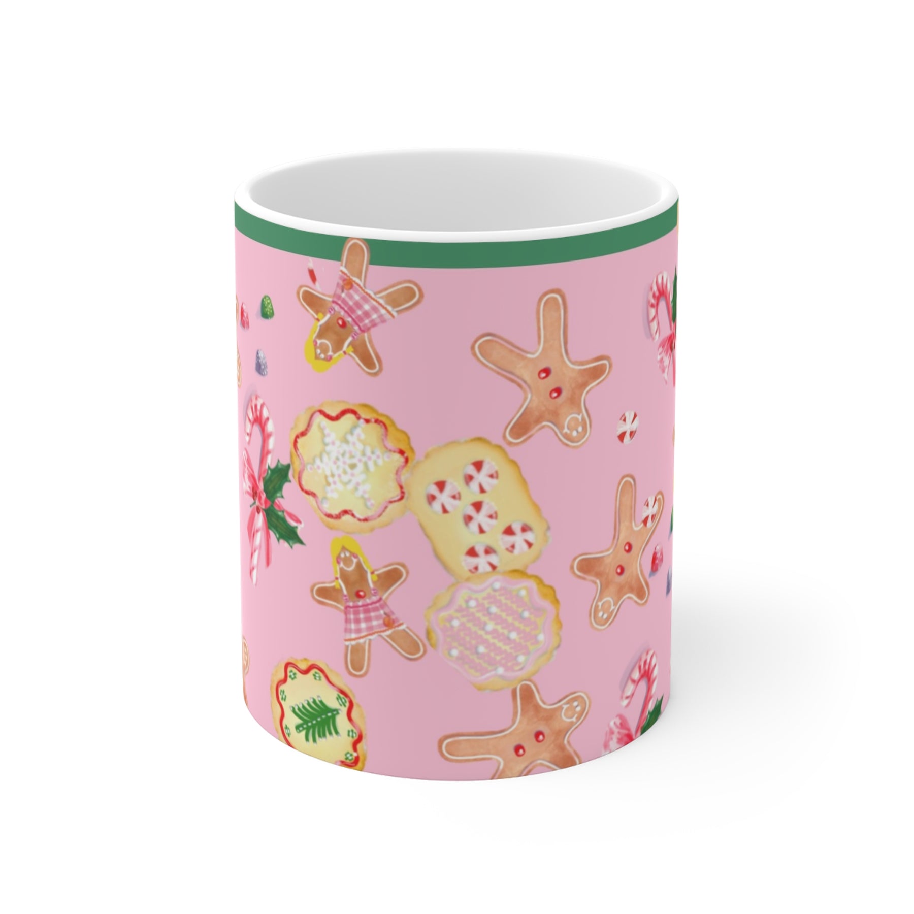 Mahjong, Candyland style...Bright, cheerful ceramic mug patterned with whimsical holiday cookies and candy on a soft pink background. Each sip brings a cozy, nostalgic moment — like sneaking a treat from the cookie tin or wrapping your hands around a warm cup after decorating the tree. The playful illustrations (gingerbread friends, candy canes, and frosted rounds) add a sweet pop of color to morning routines and slow afternoons alike. It sits well on a cluttered desk, a kitchen shelf, or beside a stack of recipe cards, making everyday pauses feel a little more festive and comforting.